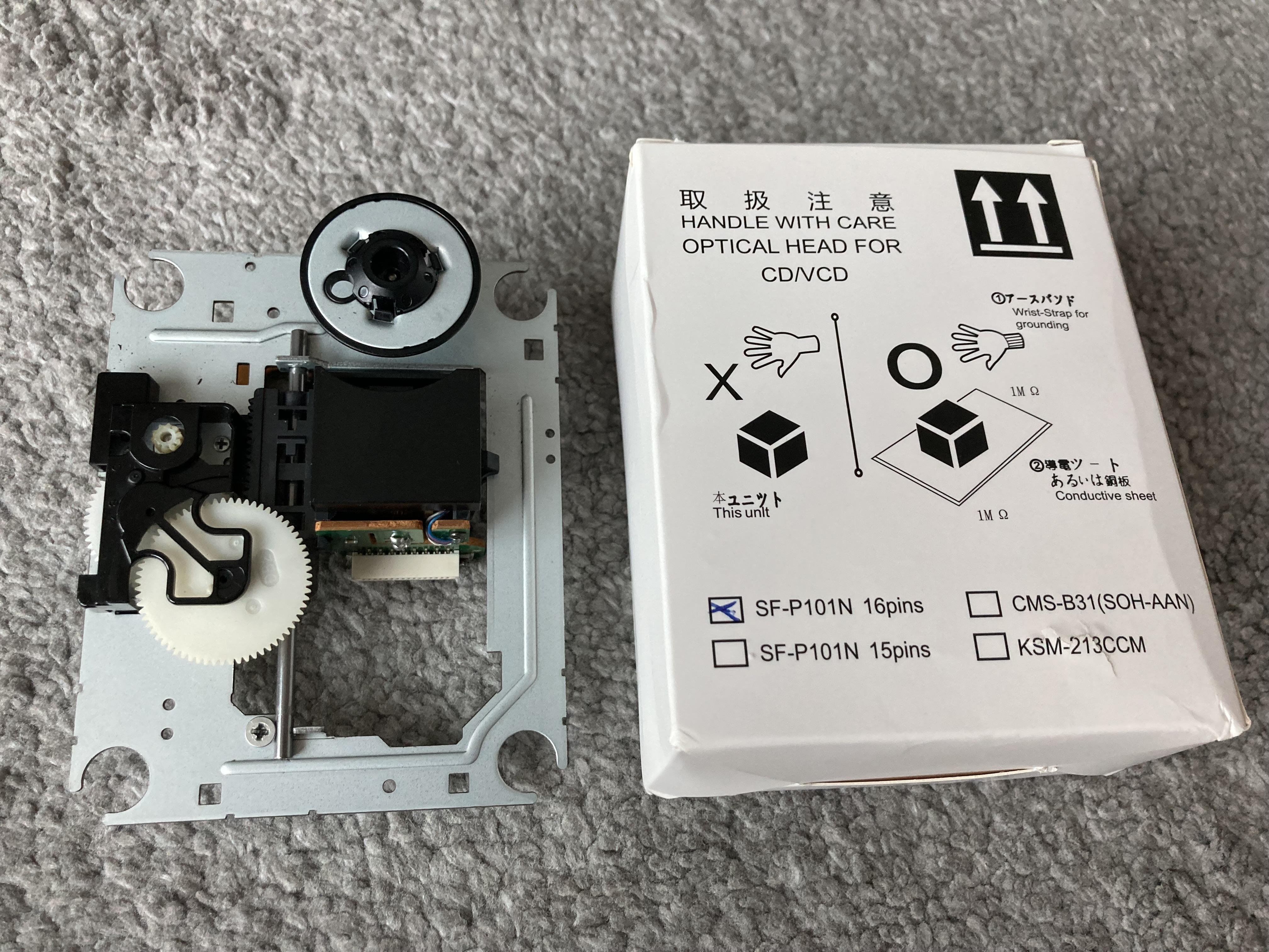 사진과 같이 통에 SF-P101N 16P라고만 적혀 있다. 업자 말대로 중국제다. 교체하니 잘 읽는다. 여러 음반을 들어 보았지만 아무런 이상이 없다. 그런데 문제는 음질이다. 너무 탁하고 저역이 과도하게 나온다. 며칠을 듣다가 빼버리고 만다. 원래 독일에서 온 것으로 교체한다. 다시 튀기 시작한다.