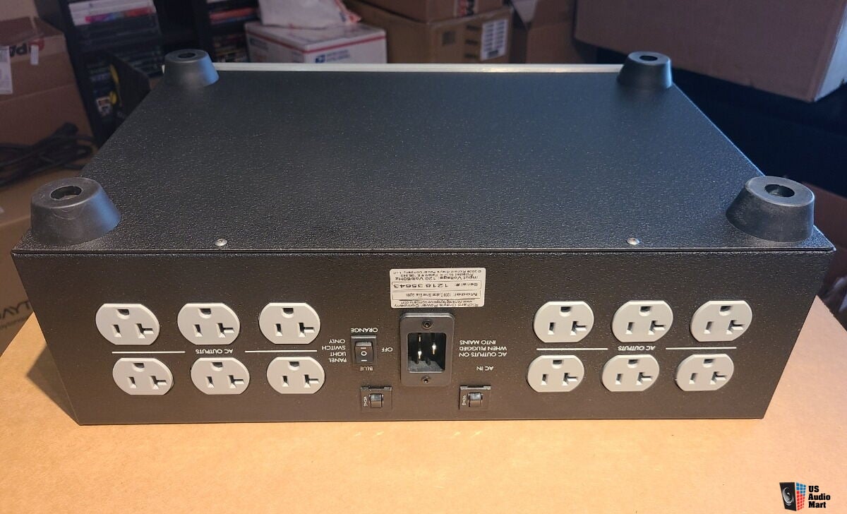 신형은 뒷면이 바뀌었는데 100볼트용이라 콘센트가 각각 6개다. 그리고 인렛에 스위치가 생략되고 용량이 10A에서 20A로 늘어났다. 그리고 스위치는 왼쪽, 오른쪽에 각각 별도로 달려 있다. 여분의 스위치는 앞판넬 로고등 스위치다. 한편 내부도 다소 변경되었는데 접지방식이 원포인트가 아니라 콘센트를 같이 묶었고 필터가 단독형이며 휴즈는 삭제되었다. 한때는 스위치 대신 휴즈 박스가 있던 것도 있었다. 스위치, 휴즈 모두 음질에는 좋지 않고 직결이 좋다.