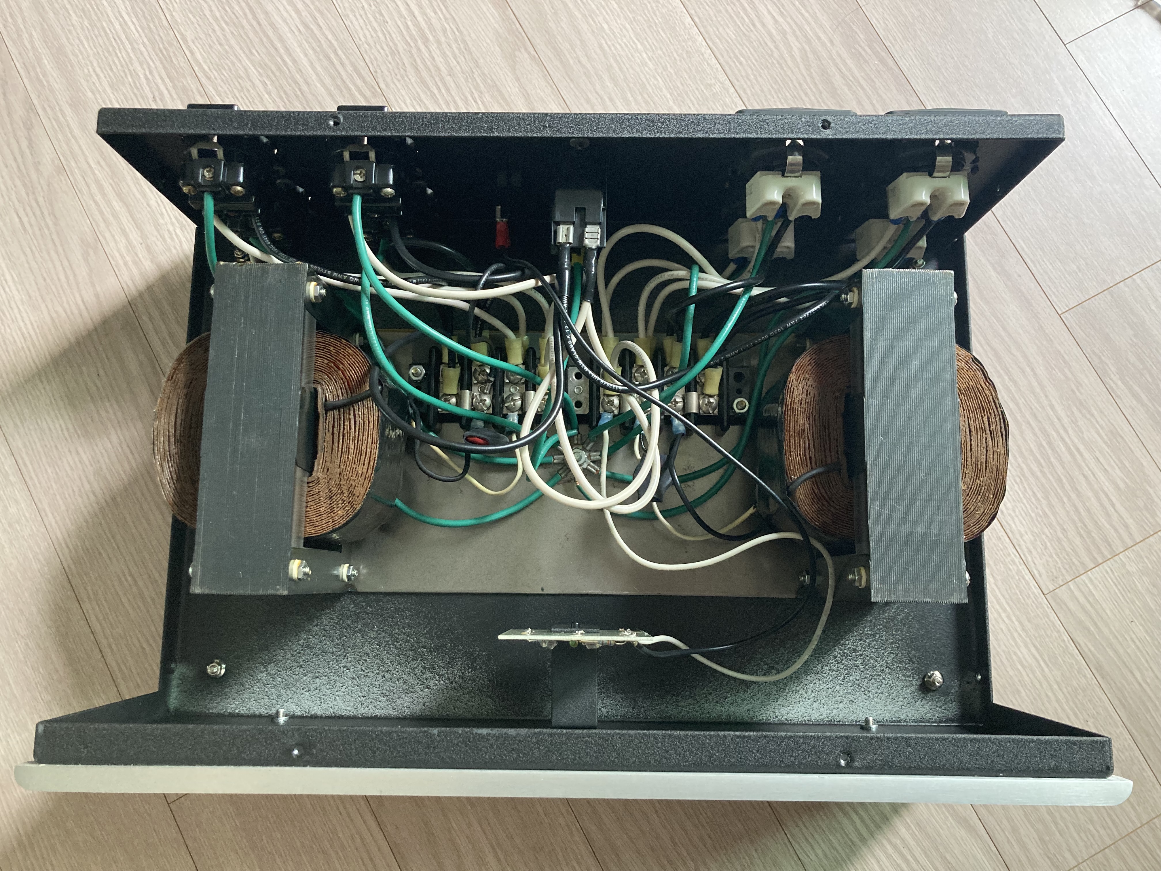 알아보니 미국에서 전원장치만을 전문으로 생산하는 리차드 그레이사의 쵸크 트랜스가 내장된 8구의 멀티탭이다. 내부를 보면 두 개의 큰 트랜스가 있는데, 이것이 쵸크 트랜스라는 것으로 철코어에 구리를 감은 트랜스에 전기를 흘려보내면 에너지를 저장한다고 한다. 그래서 큰 부하가 필요할 때 충분한 전기를 공급하여 소리가 좋게 된다고 한다.