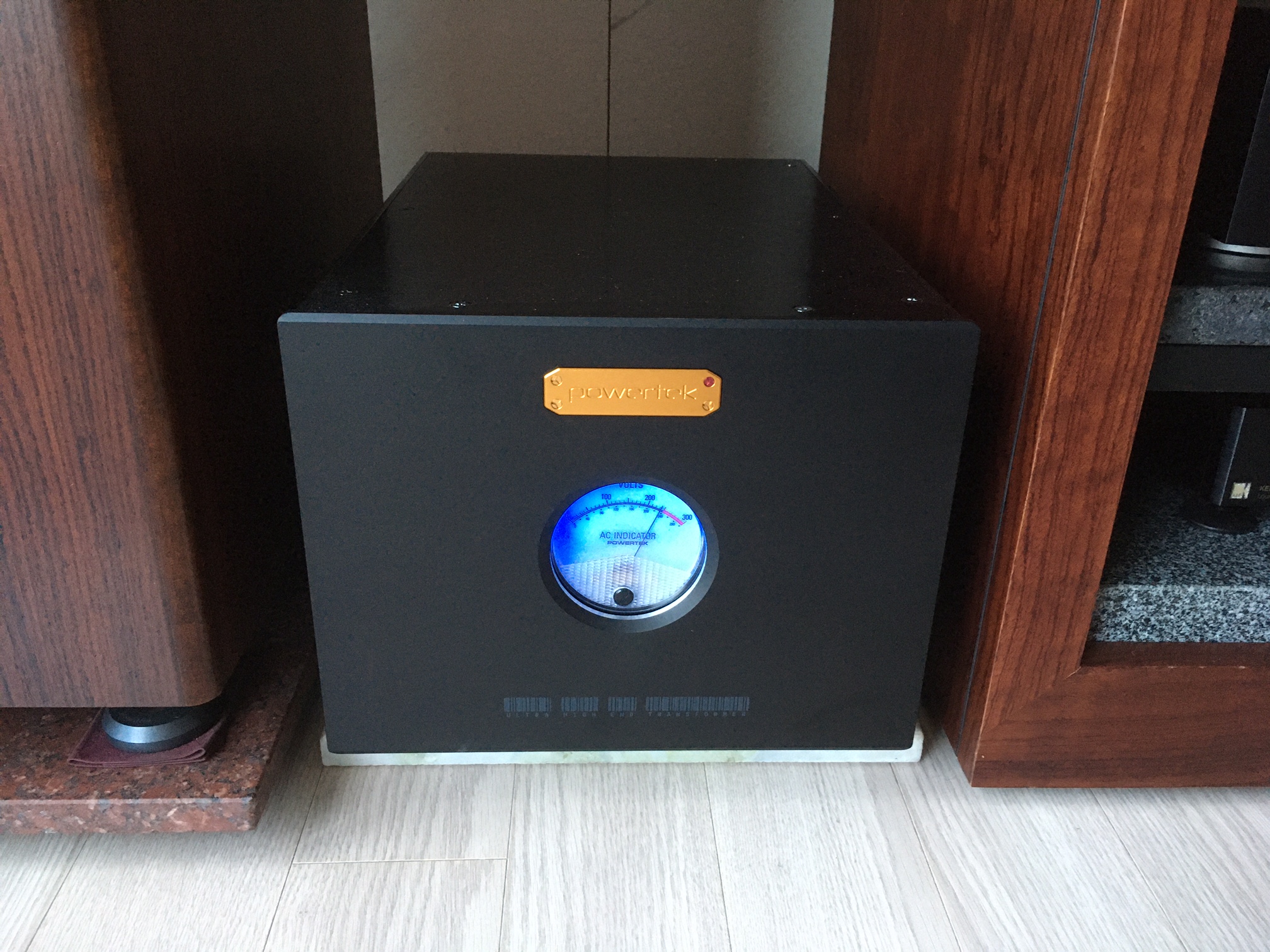 이름은 "파워텍 IT-3000 골드 허당수 버전(길다)"으로 3kW에 일반 선재 배선이고 단 한 개의 콘센트만 단결정 은선(네오텍 미터당 33만 원) 배선 그리고 콘센트는 극저온 베커를 사용하게 된다. 그리고 인렛은 극저온 동일기연이고 여기에 선재를 연결하는 방식은 기존의 납땜이 아닌 순동 후루텍 패스톤을 사용한다. 그리고 베커에 연결되는 러그는 모두 극저온 처리된 것이다. 또한 별도 2차 접지는 연결하지 않았고 차단용 전원 스위치도 두 선용이 아닌 한 선만을 위한 것으로 구성한다. 배선 연결은 직결을 우선하였고 선들을 케이블타이로 따로 묶지 않았다.(보기는 좋아도 음질에 불리하다) 또한 단결정 선재로 배선을 하지 않은 것은 너무 선명하고 단단한 음상이 개인적으로 맞지 않아서이다. 정말 주목할 것은 용량이다. 사실 3kW급 차폐라고 하더라고 실제 운용 시 100W 미만의 인티앰프나 아니면 프리앰프 내지 씨디피에 적합한 것이었다. 말하자면 본격적으로 음질의 열화를 느끼지 못하는 시점이 바로 3.5kW라는 것이다. 특히 저역의 양감이 비약적으로 향상되어 차폐를 썼을 때 투명한 음질의 개선은 좋으나 뭔가 빈약한 느낌을 받았던 것이 바로 이 3.5kW급에서 극적으로 개선이 된다는 것이다. 물론 5kW로 올리면 더욱 좋으련만 그것은 현실적으로 많은 어려움이 따른다. 사실 IT-3000만 하더라도 무게가 35kg이 넘는다.